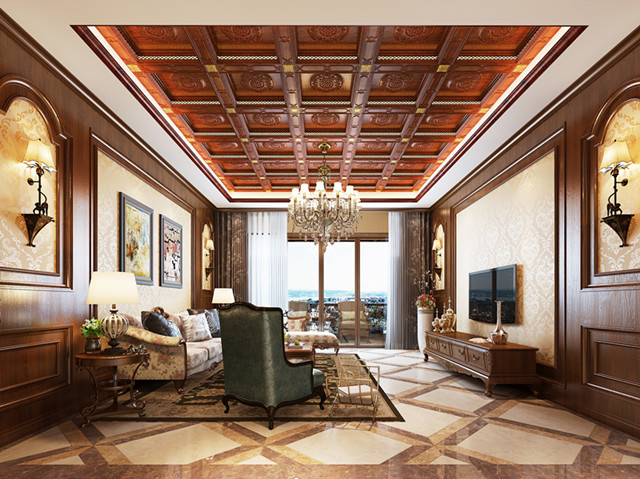 美式古典風(fēng)酒紅色的深沉質(zhì)感,散發(fā)著迷人而成熟神秘的魅力。燈光帶與橫梁架構(gòu)交錯(cuò)衍生,帶來(lái)熠熠璀璨的視覺(jué)享受,多層次的躍層效果是整個(gè)頂部更加古典優(yōu)雅,仿佛置身于中世紀(jì)的羅馬時(shí)代。