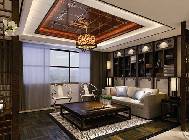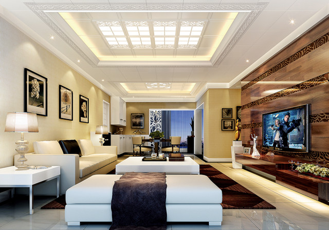 大面積白色的客廳吊頂布局使空間顯得簡(jiǎn)約大氣。層層遞進(jìn)的躍層造型,有助于實(shí)現(xiàn)輕松、隨意的生活方式。中央?yún)^(qū)域帶有精美紋飾的板材與燈帶的點(diǎn)綴,增添了空間的美感與情調(diào),又豐富了客廳的藝術(shù)內(nèi)涵。