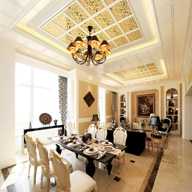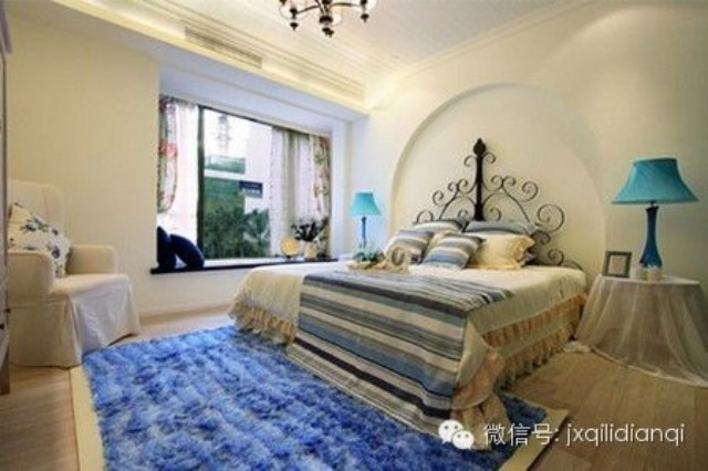 美式古典風格在空間上追求連續性,追求形體的變化和層次感。這個房間以美式古典宮廷風格為主,以復古的白色和金色為基調。室內外高貴典雅,光影變化豐富。為體現宮廷風格,家具、門,窗都漆成白色,藍色的布藝沙發,金色的畫框壁畫,金色系的地毯,帶有一種異域的視覺沖擊。用壁爐的造型打造的電視柜使得一家人看電視時的感覺更為溫馨。