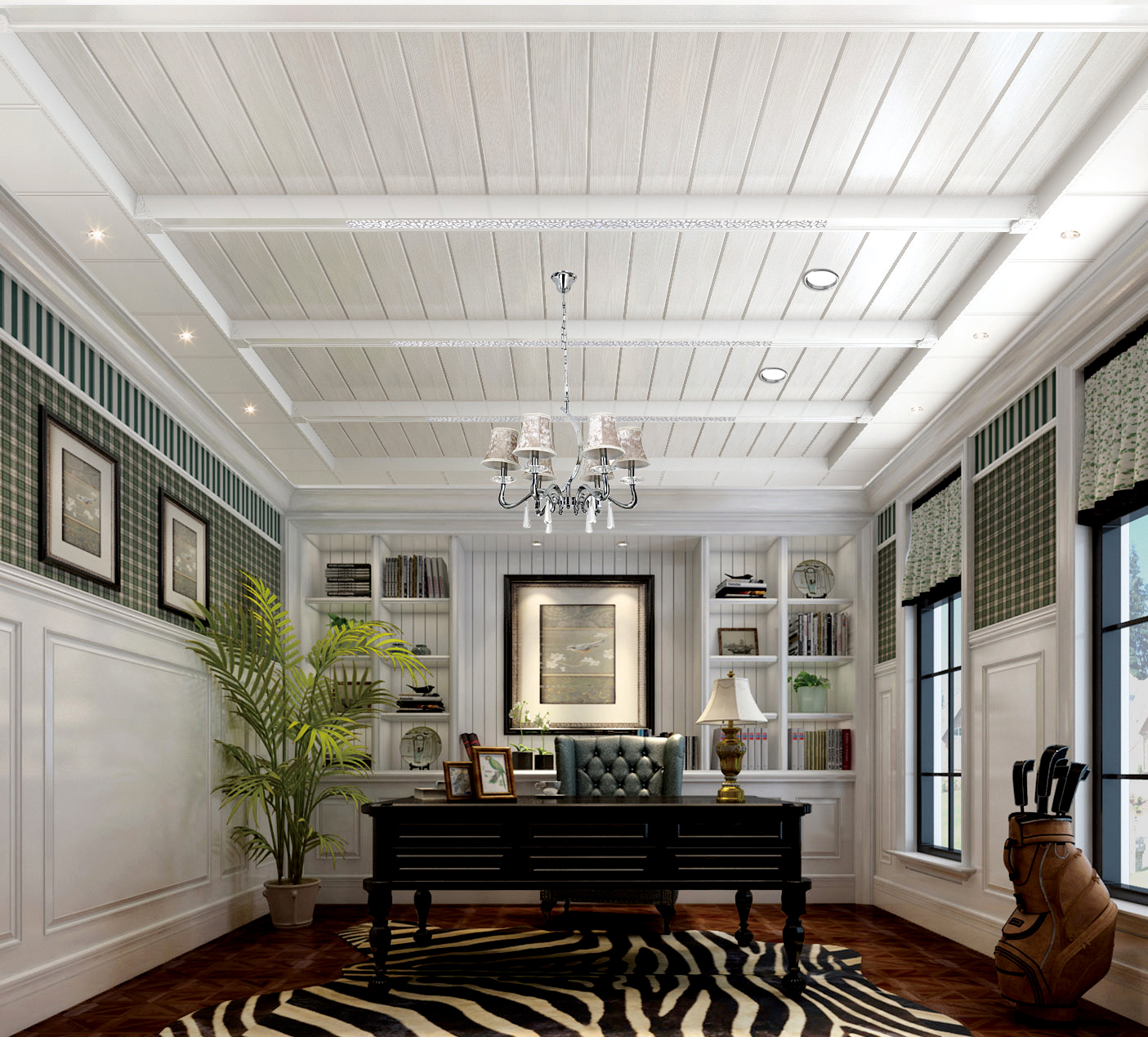 中式風格的書房,符合典雅、樸實、具有傳統意義上的“書齋”的韻味。“斯是陋室,唯吾獨馨”就是中式風格書房的完美演繹。紅色仿木紋樣式的吊頂,置入中式家具,加上中式書柜、茶幾及屏風,配以中國字畫和古玩等點綴其間,就構成一幅中式風格的書房藍圖。進入這個書房學習,你是不是也會有種穿越的感覺。
