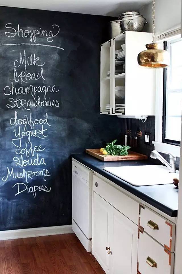 廚房里裝個黑板墻,不知道是不是玩出新高度的一種,既可以學習,又可以安利各種菜單。有沒有覺得很不錯啊,隨手來個幾筆,無論大人小孩都愛上這里。