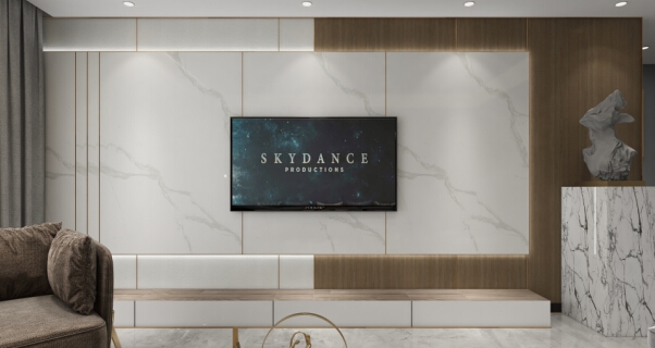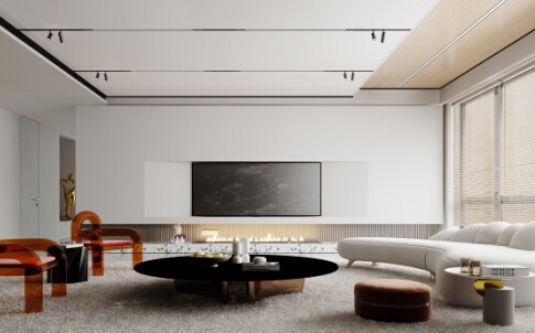 黑色波浪板在巖紋板與木紋板之間時尚過渡,這樣搭配出來的沙發背景墻,既擁有肌理的細節,還給空間帶來了層次感與節奏感。